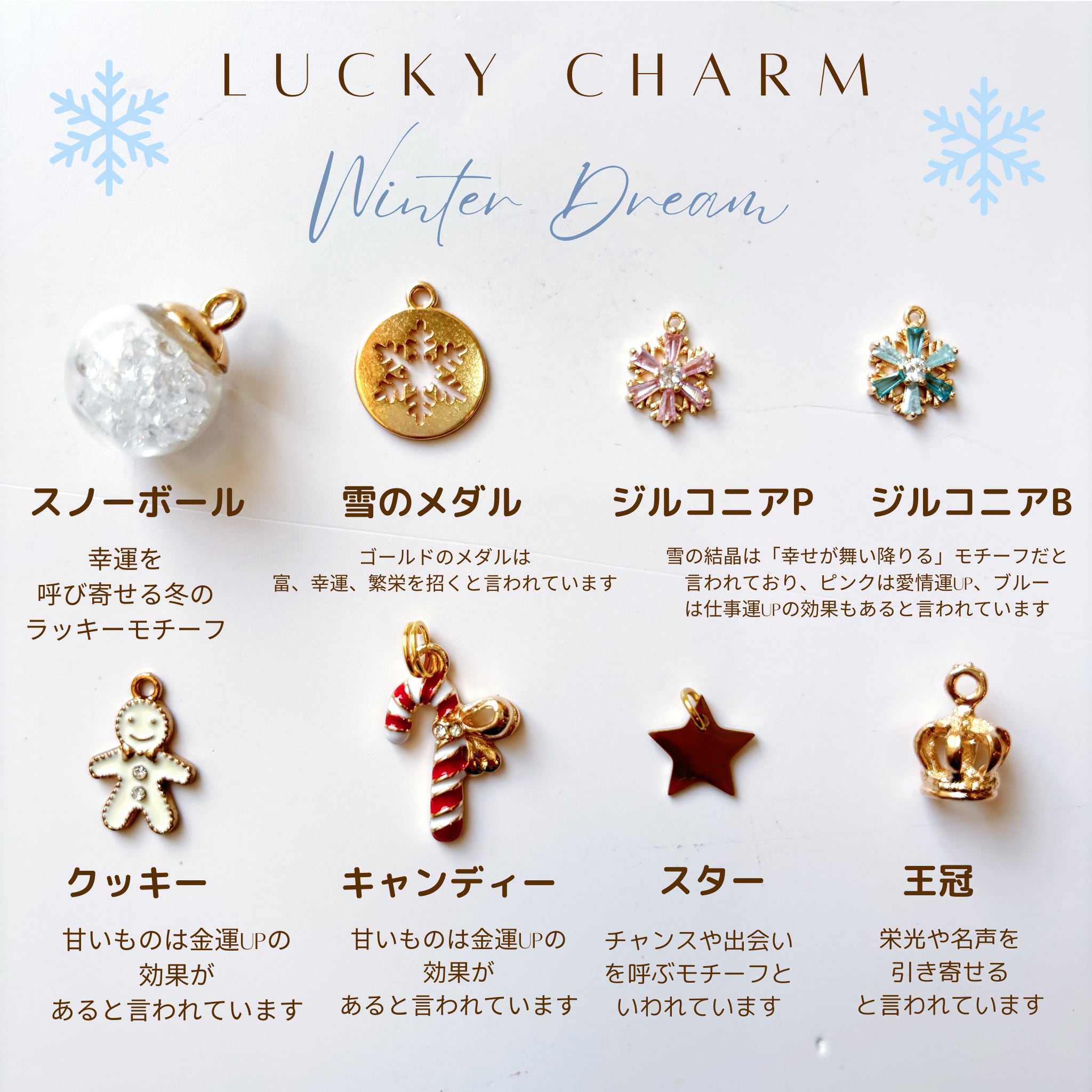 雪の結晶チャームは冬にぴったりのモチーフです。